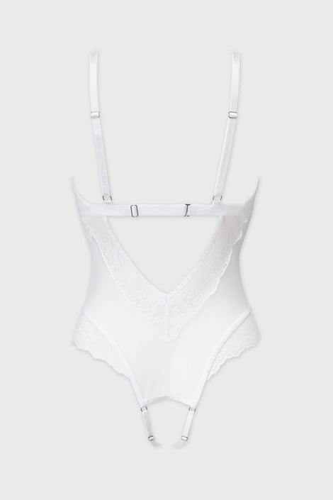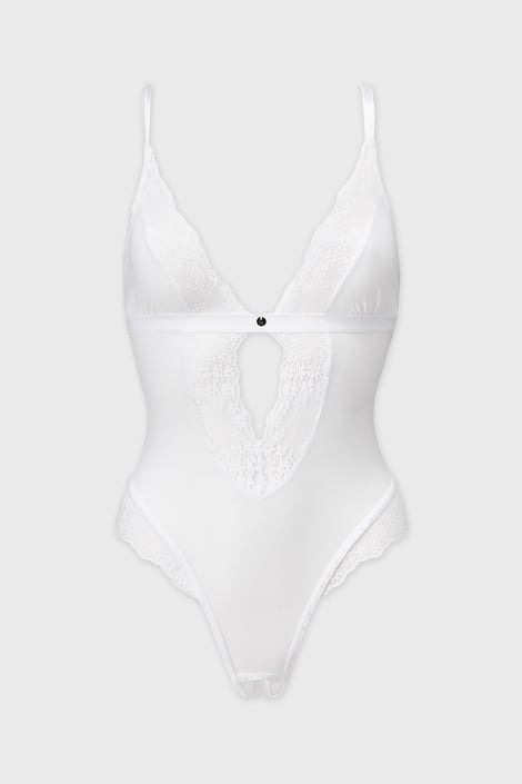 Body erotic Obsessive Heavenlly din plasă rafinată ușor transparentă și dantelă elegantă. Vei fi irezistibilă în culoarea albă nevinovată și croiala seducătoare.