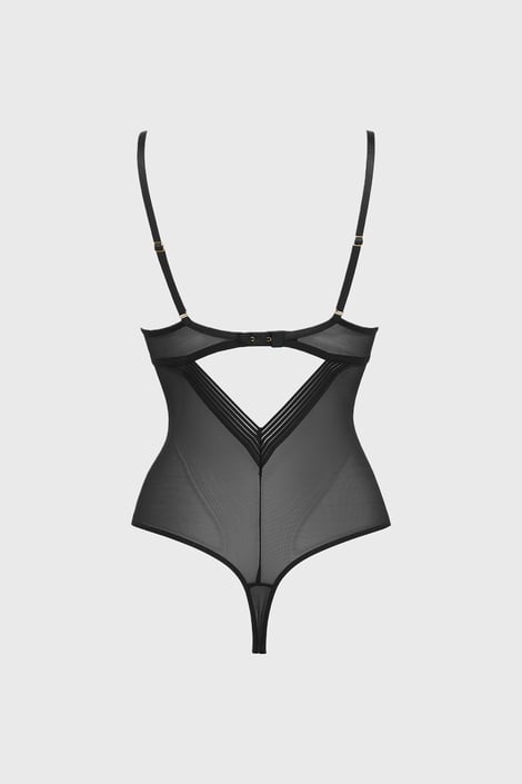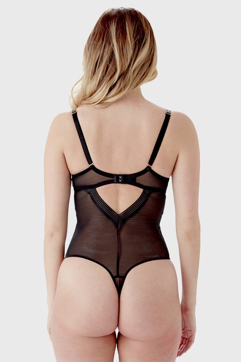 Body elegant Gossard Sheer Stripe din țesătură cu plasă moale, care îți dezvăluie subtil curbele. Cupele neîntărite, din material dublu nu numai că oferă sânilor un aspect complet natural, dar și o formă rotundă și frumoasă, datorită croielii în T. Zona chilotului în croială tanga modelează frumos fesele.
