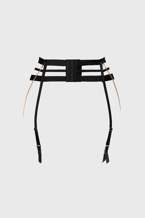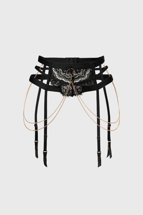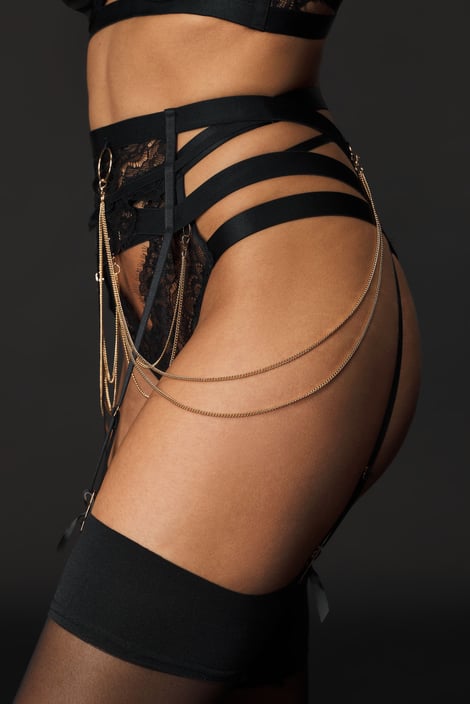 Centură portjartier Hunkemöller Tallulha dintr-o combinație de efect dintre dantelă, benzi strappy și aplicații cu lanțuri. Piesă neobișnuită pentru momente speciale în doi.