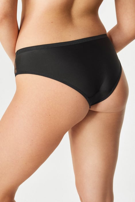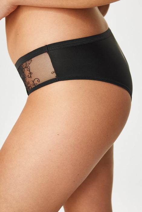 Chiloți eleganți Athina cu o croială clasică. Microfibra netedă alternează pe părțile laterale cu tul fin, cu broderii pline de imaginație.