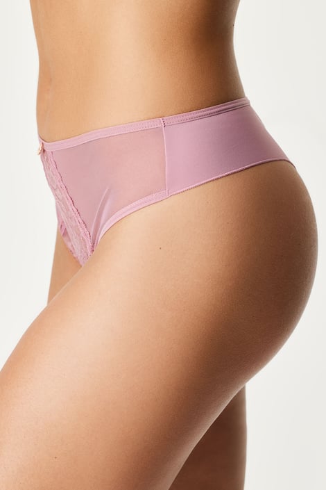 Chilotul brazilian Jeanne Lily învăluie curbele feminine într-o nuanță delicată de roz pastelat. Partea din față este dintr-o combinație de dantelă și plasă fină, iar cea din spate este din microfibră netedă.