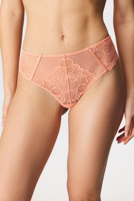 Chilot tanga Kimora în nuanță coral delicată. Din tul transparent și dantelă florală.