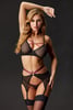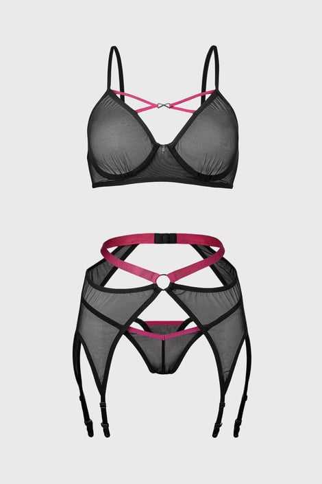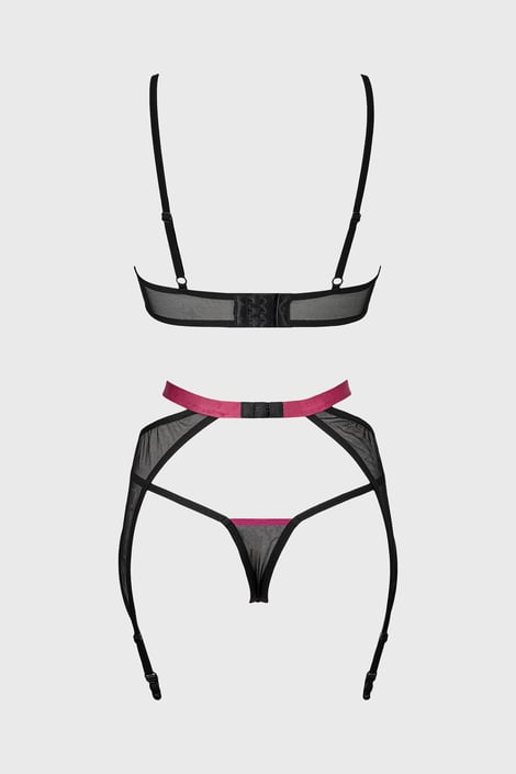 Condimentează momentele romantice pentru doi cu setul erotic Obsessive Novenes din tul moale și bretele roz contrastante. Sutienul cu cupe neîntărite este decorat cu benzi strappy cu aplicație de strasuri. Portjartier cu doua perechi de suporturi pentru ciorapi. Chilotul tanga evidentiaza fesele.