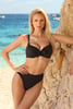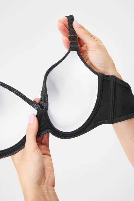 Costumul de baie negru strălucitor Calimera din două piese din material structurat pentru costume de baie îți va oferi o senzație de lux. Cupele întărite, cu balene, cu efect push-up, modelează un decolteu frumos. Bretelele reglabile asigură o potrivire confortabilă, adaptată dimensiunilor tale. Partea din față a sutienului este decorată cu o fundă și cu strasuri. Slip clasic cu talie mai înaltă.