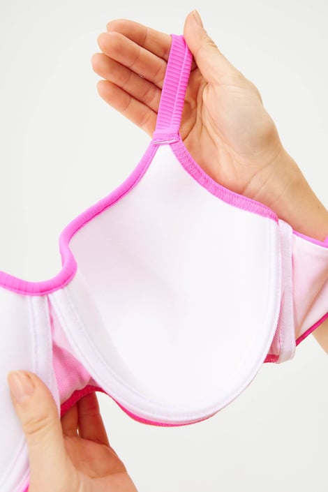 Vei fi de neratat în costumul de baie din două piese Tina Neon. Sutienul în nuanță neon întărit Push-Up asigură un decolteu frumos plin. Cu decor auriu între cupe. Slipul în croială clasică are o structură striată și este căptușit cu un al doilea strat de material pentru costume de baie pentru un confort sporit.