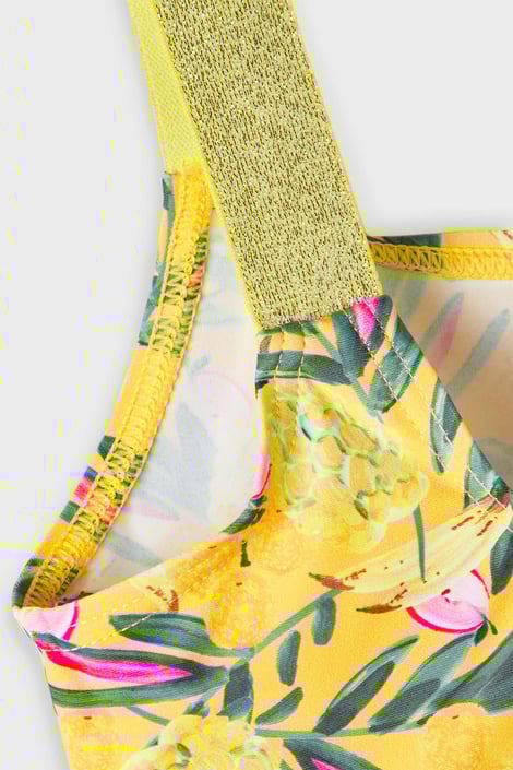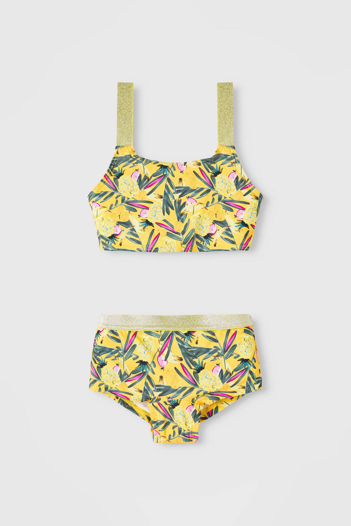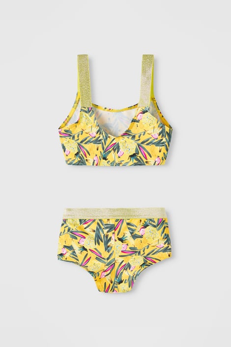 Costum de baie din două piese pentru fete name it Zarli cu motive tropicale și elastic lucios, model pe care și-l vor dori toate fetițele.