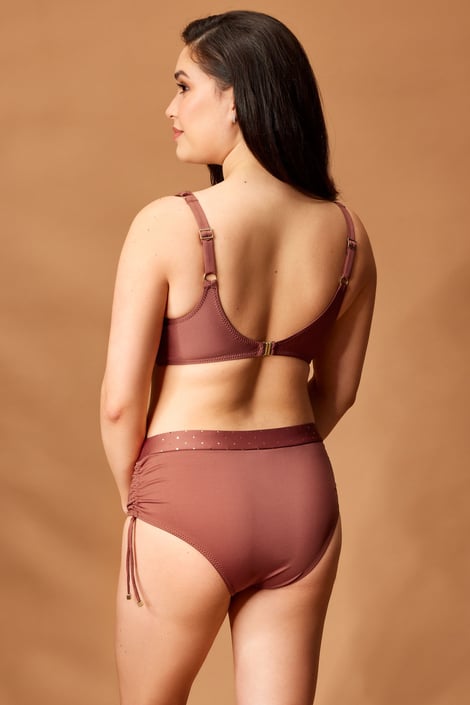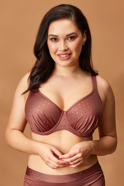 Costumul de baie din două piese Maia Glitter Brown Plus va avea grijă de confortul curbelor feminine mai pline. Cupele realizate din material unic se adaptează ușor, balenele și bretelele căptușite moi asigură un sprijin perfect. Slip clasic cu șnururi pe laterale, pe care le poți folosi pentru a regla înălțimea tăieturii slipului..