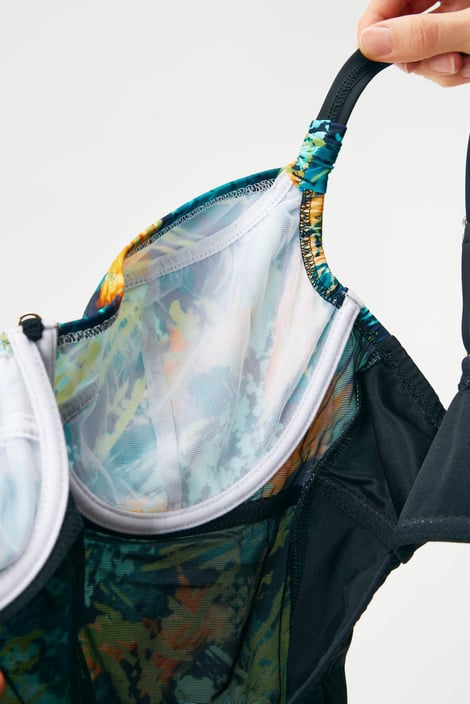 Costumul de baie Pia modelează ușor formele feminine pline. Partea din față este căptușită cu material cu efect modelator pentru costume de baie care netezește și modelează zonele cu probleme. Draparea ușoară pe părțile laterale flatează vizual silueta.