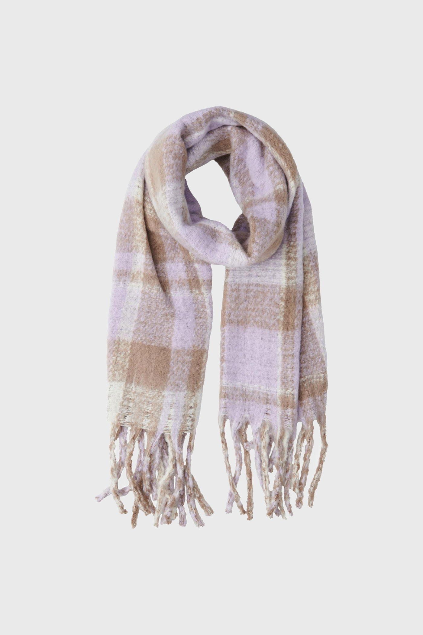 Fular de iarnă Pieces Naora de damă, cu motive subtile în carouri. Capetele sunt decorate cu franjuri delicate.