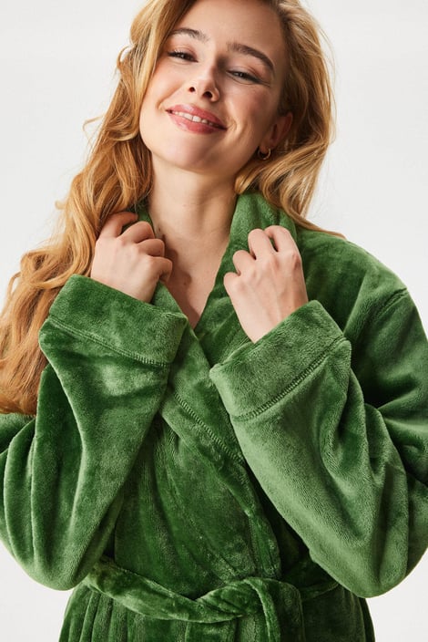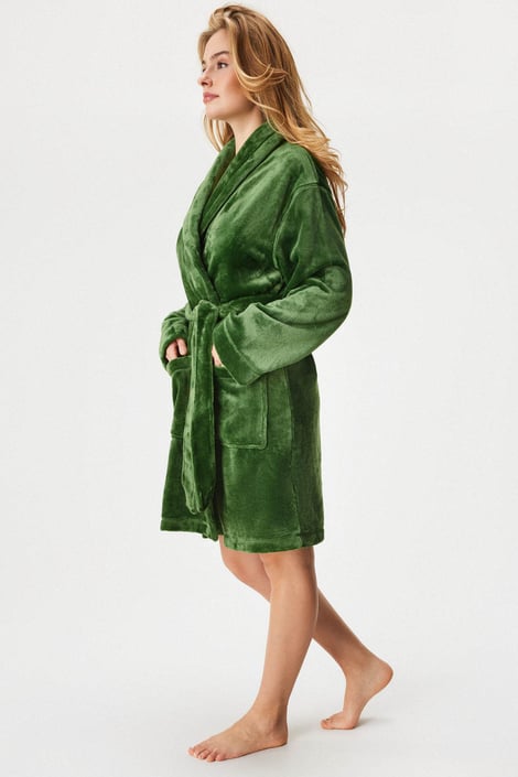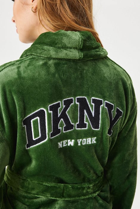 Halat scurt Elm Green de la marca premium DKNY, confecționat din microplush călduros, într-o culoare verde elegantă. Design simplu, cu guler șal, buzunare și cordon în talie.