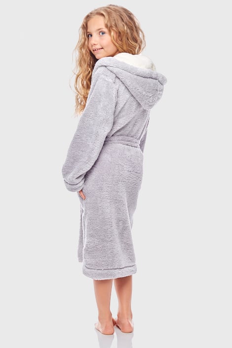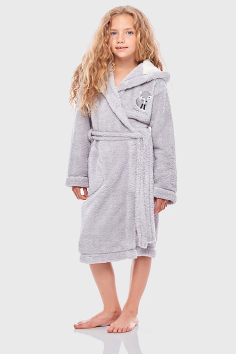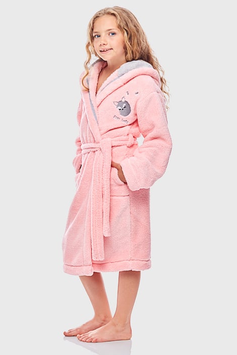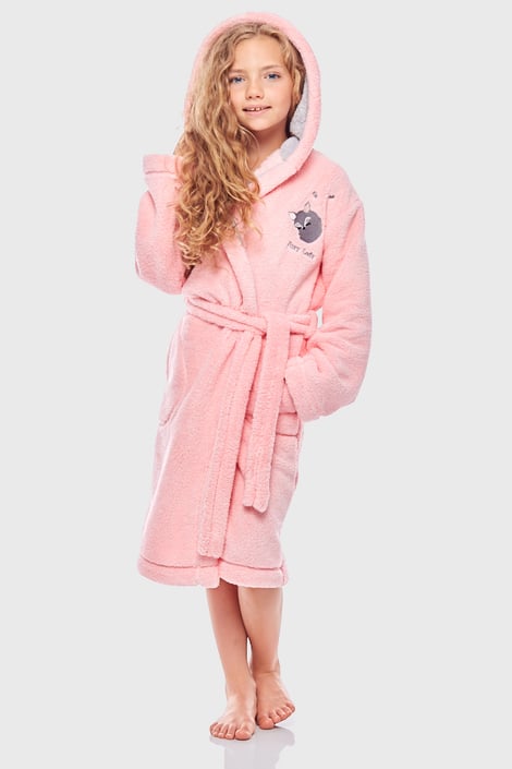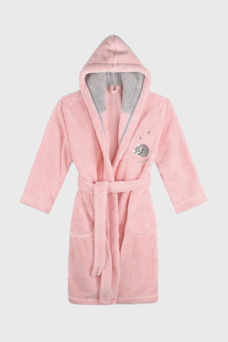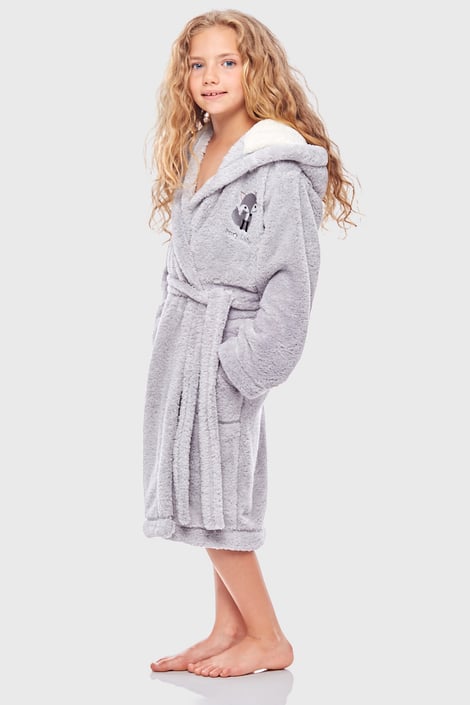 Halat pentru fete Fox din micropluș moale pentru momentele de odihnă. Croială clasică cu buzunare, glugă și cordon în talie.