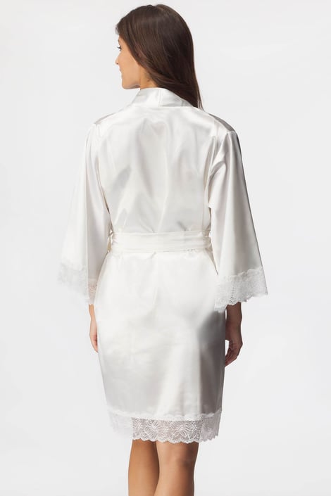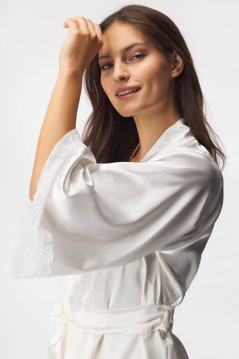 Oferă-ți o notă de eleganță pe timp de noapte în halatul Sauda. Satinul decent și strălucitor este moale la atingere și curge grațios. Capetele mânecilor și tivul sunt decorate cu dantelă delicată.