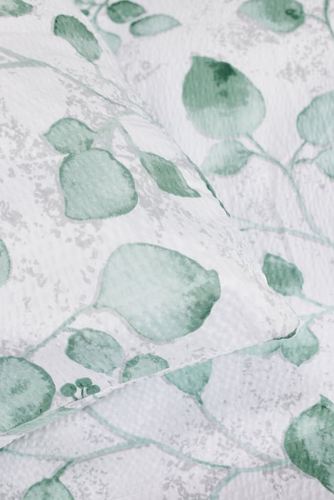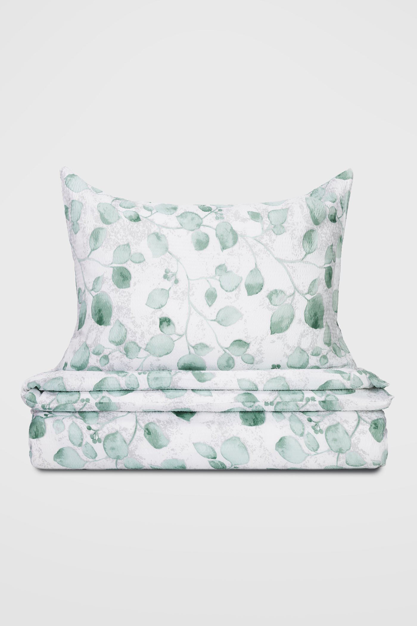Lenjeria de pat Eukalyptus din material creponat practic, care nu trebuie călcat. Închiderea cu fermoar ușurează îmbrăcarea.