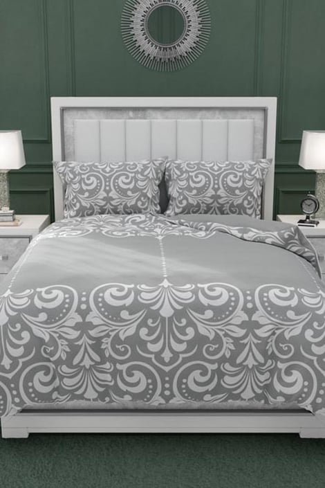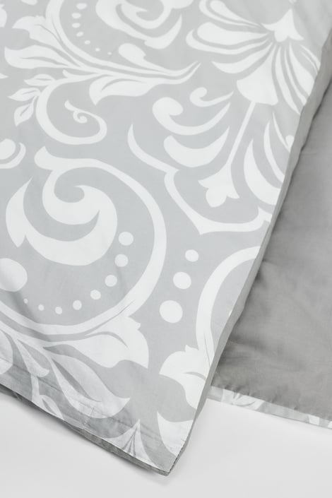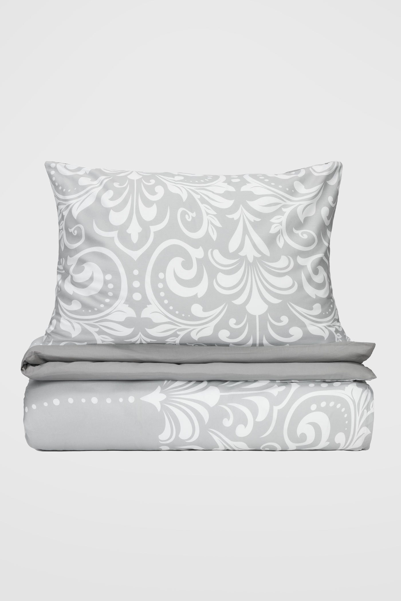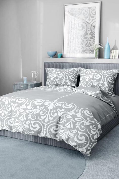 Oferiți dormitorului dvs. un aspect elegant și acoperiți perna și plapuma cu cearceafurile din bumbac Glamour Queen. Prezintă un motiv elegant alb și gri pe o parte și un design monocrom gri pe cealaltă parte.