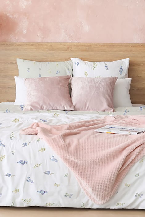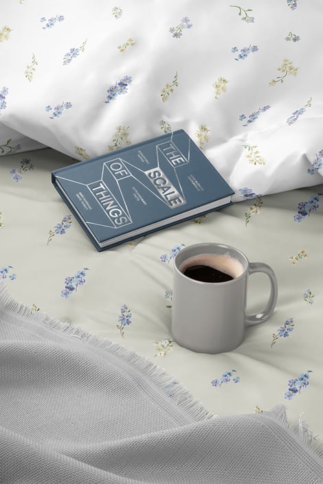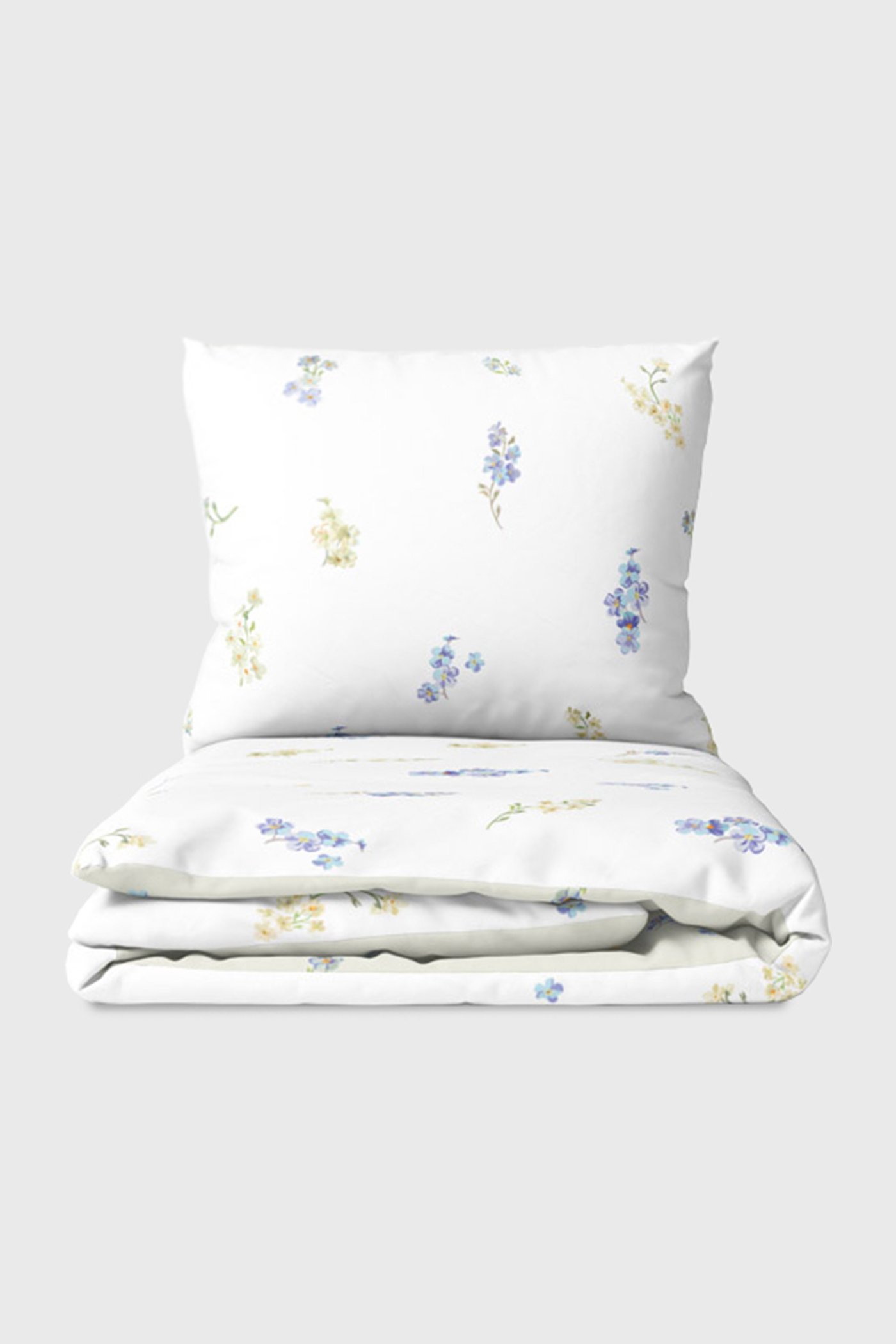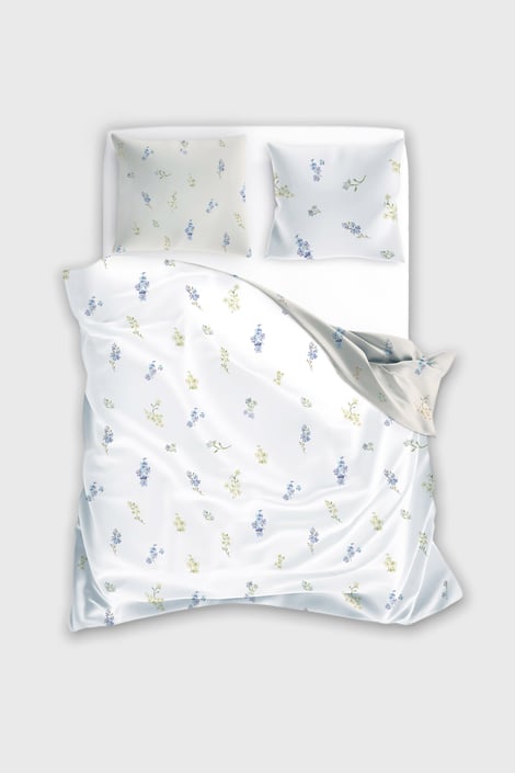 Ambalat într-o pungă albă din bumbac cu flori în același design ca și lenjeria de pat.