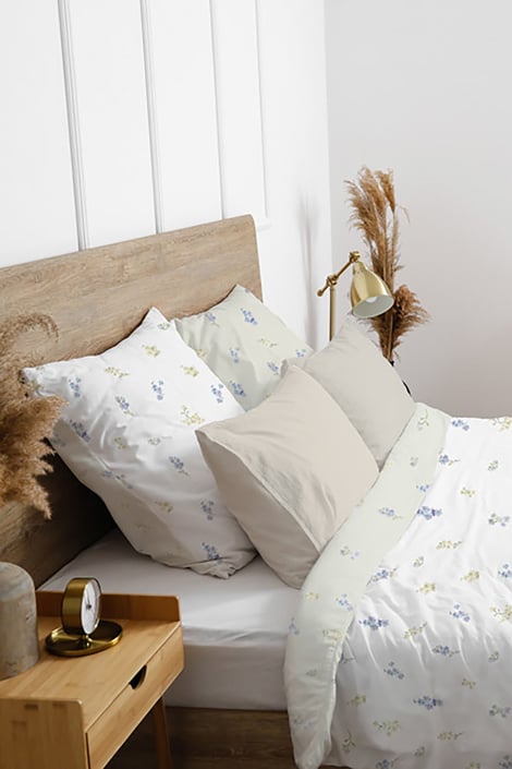 Lenjerie de pat Home Cottage din bumbac cu un design floral fermecător. Modelul este pe fond alb pe o parte și bej pe cealaltă parte.
