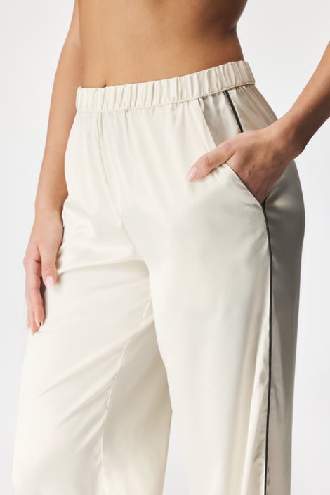 Pantaloni de pijama Regardless, din satin elegant. Sunt moi la atingere și se aşază grațios pe corp. Părțile laterale sunt decorate cu o dungă neagră. Din colecția cântăreței britanice Raye.