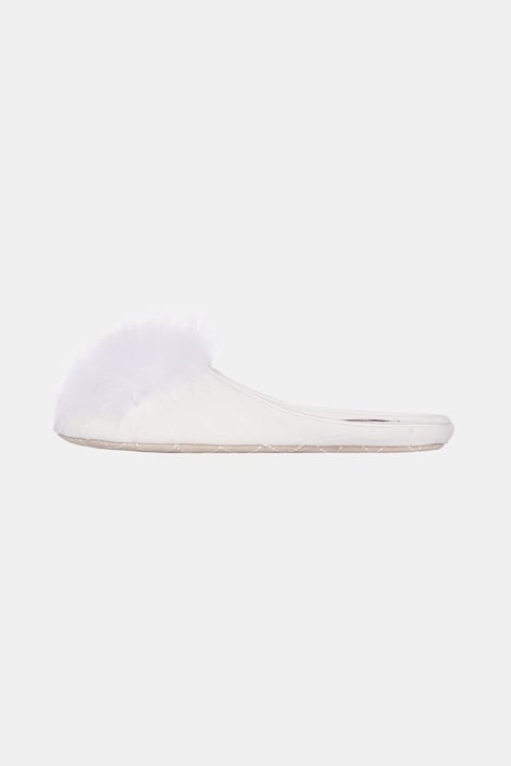 Papuci de casă Happy din material matlasat moale și căptușit. Decorat cu pene în partea din față.