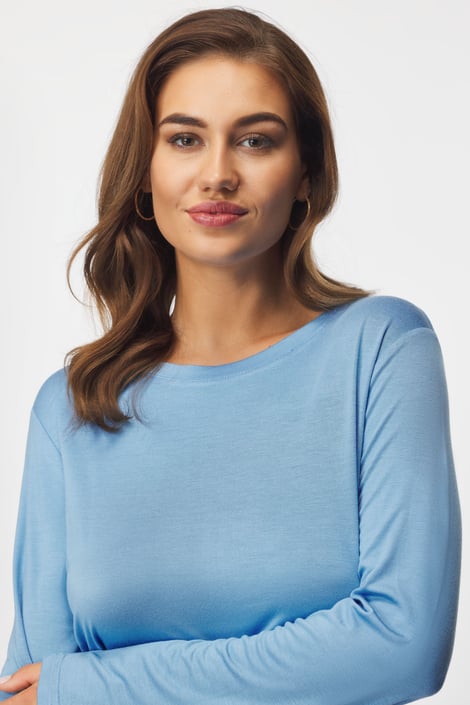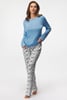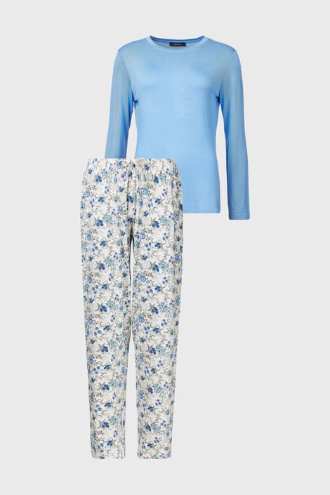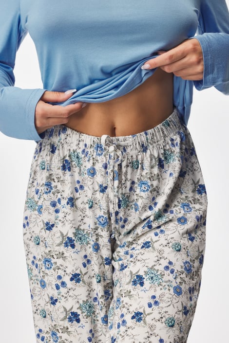 Pijama de damă Calming Flowers din viscoză moale pentru confortul tău pe timp de noapte. Bluza simplă în nuanță de albastru pastel este completată de pantaloni lungi cu motive florale delicate. Din atelierul Astratex.