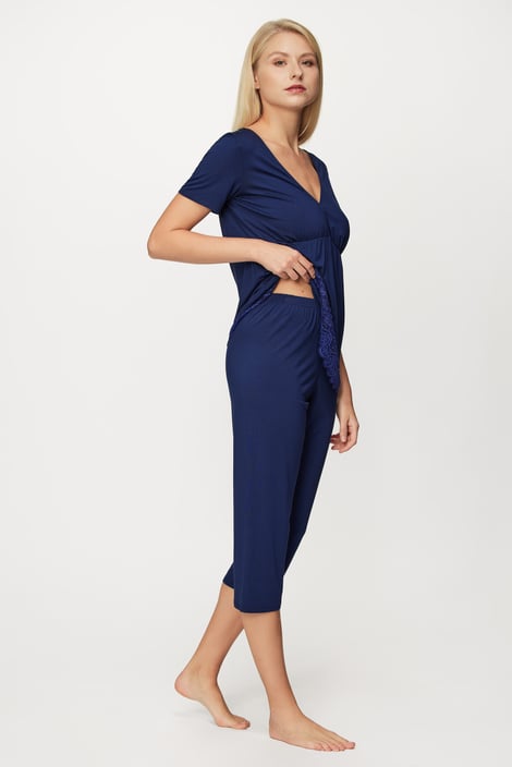 Pijamaua de damă Bedtime vă învăluie în viscoză ușoară și extrem de moale. Tricoul în nuanță de pudră este finisat cu dantelă decorativă, iar pantalonul scurt este monocrom. De la brand-ul Astratex.