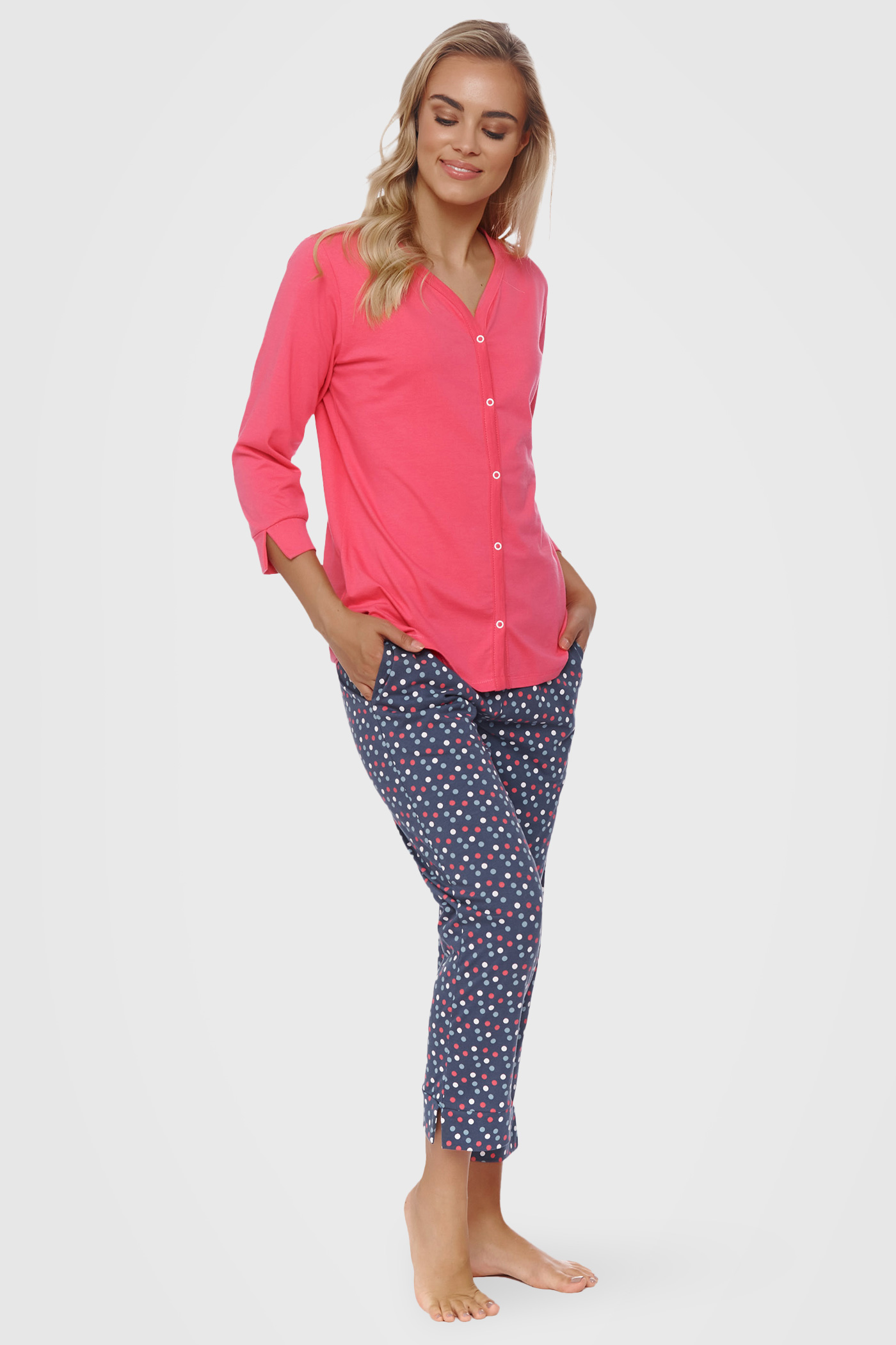 Pijamaua de damă Kenia din bumbac 100% asigură confort absolut pe timp de noapte. Bluza de culoare monocromă, cu închidere cu fermoar este completată de pantaloni lungi cu buline colorate.
