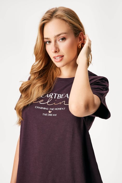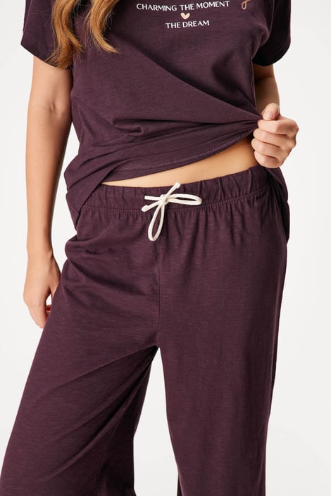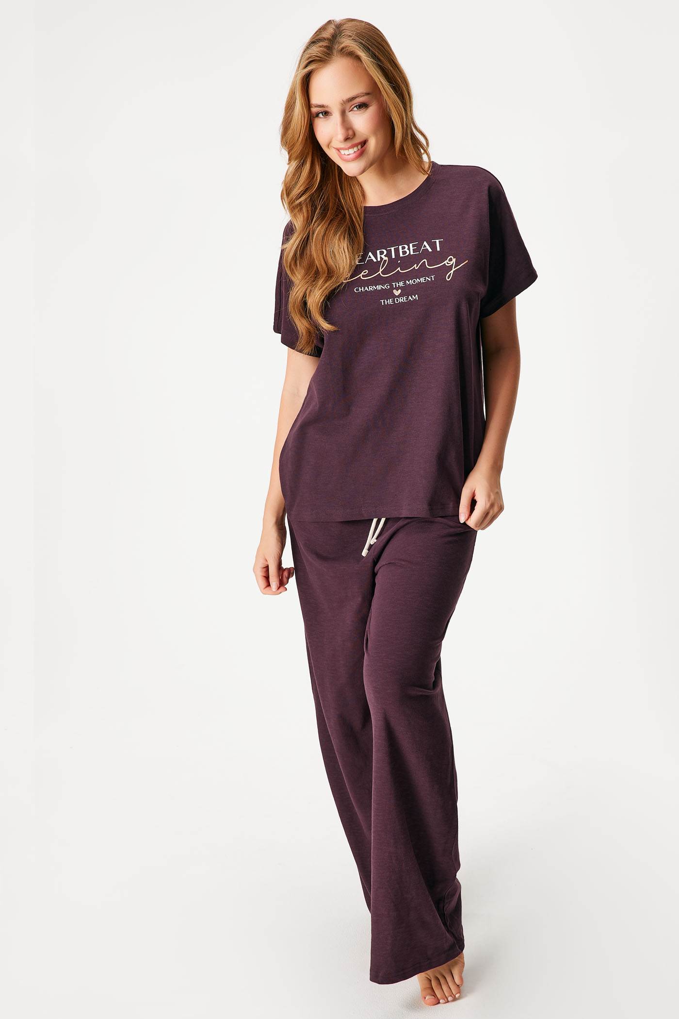 Pijama de damă Freja într-o croială si design elegant. Atât tricoul cat si pantalonii lungi în croiala clopot sunt confectionati din bumbac 100%, care este moale la atingere si placut pe corp. Cu o inscripție decentă.