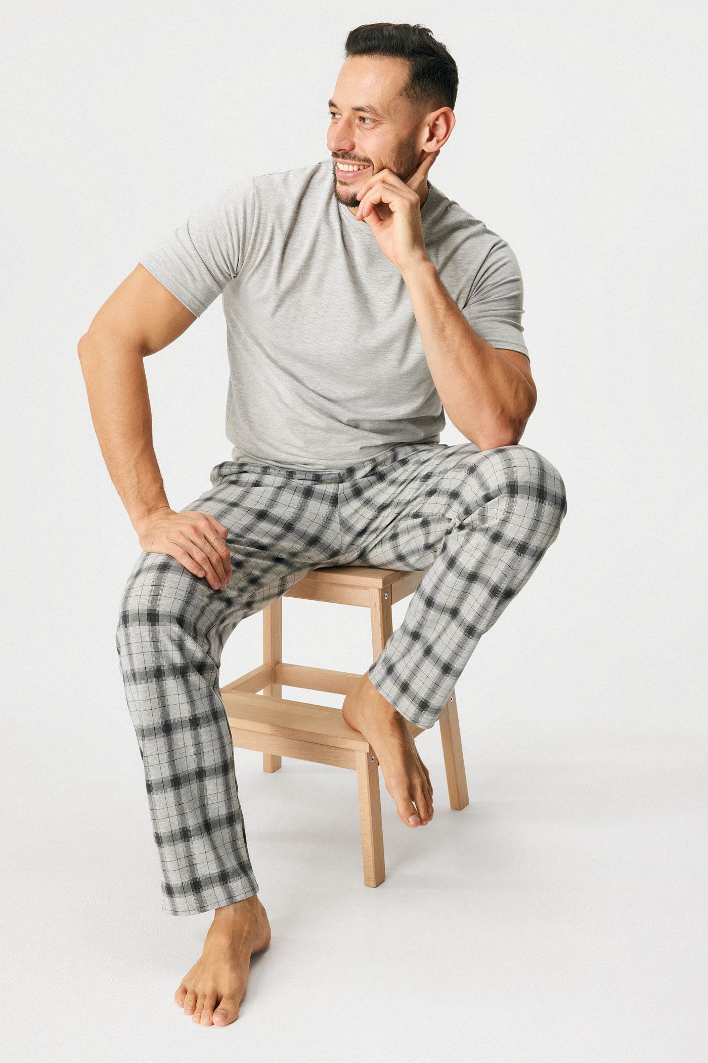 Pijama MEN-A Check din bumbac în carouri, cu un design simplu, confecționaăe din tricot moale. Tricoul simplu într-o culoare este completat de pantaloni în carouri delicate. Talie elastică cu șnur pentru legare, buzunare cusute pe laterale. Creată de specialiștii Astratex.