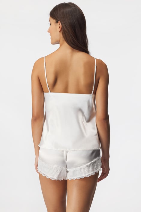 Dacă îți plac pijamalele elegante, alege modelul Hawa din satin lucios. Decolteul și marginile pantalonilor scurți sunt decorate cu dantelă florală delicată.