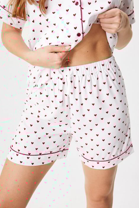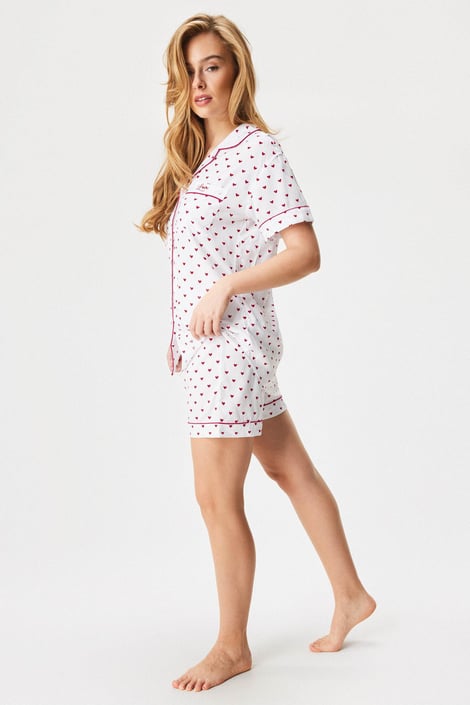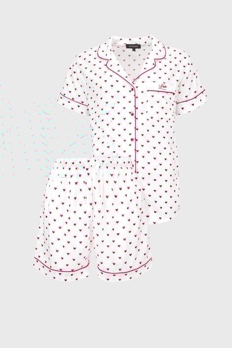 Pijamaua Dream Love pentru femei, confecționată din țesătură de vâscoză cu motiv de inimă, se va aranja frumos pe corp. Croiul clasic cu o bluză cu mânecă scurtă este completat de pantaloni scurți. Talia este confecționată dintr-o bandă elastică mai lată cu șnur pentru ajustare. Bluza este decorată cu un buzunar cu broderie. Creată de specialiștii Astratex.