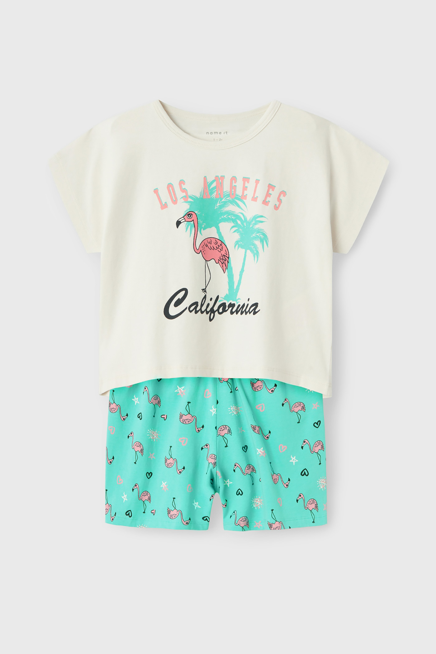 Pijama din bumbac pentru fete name it California cu păsări flamingo drăguțe.