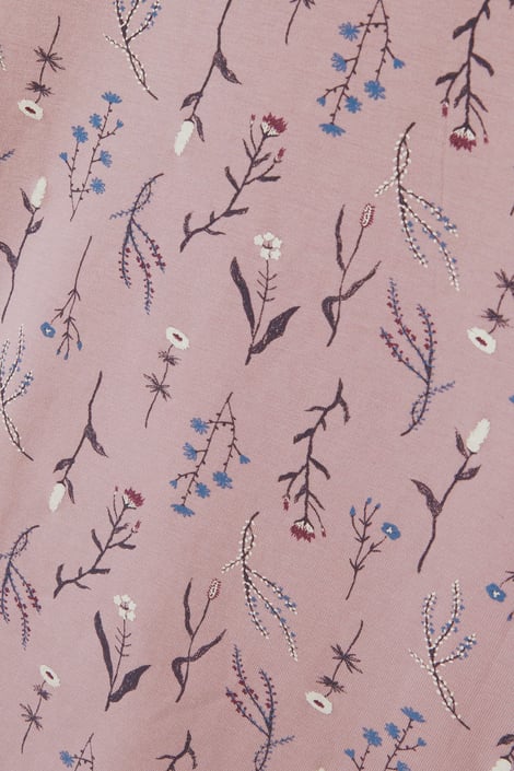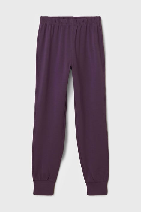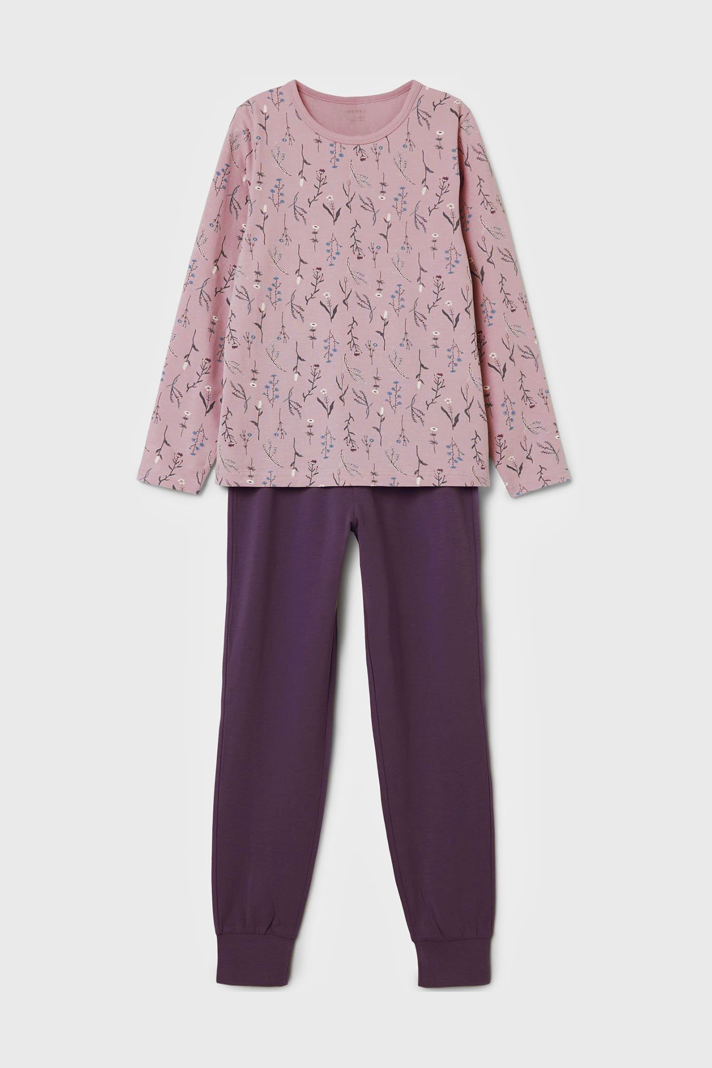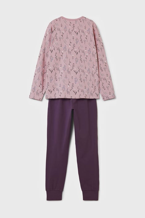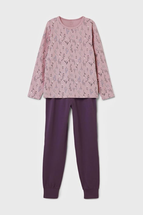 Pijama pentru fete name it Dark flower din tricot moale de bumbac. Imprimeul romantic de pe bluză este completat de pantaloni monocromi.
