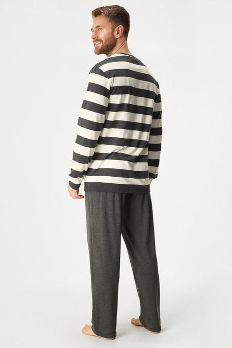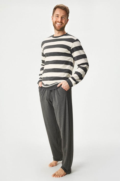 Pijamaua MEN-A Henry este garanția unui somn liniștit. Croiul lejer este foarte confortabil. Tricoul cu mânecă lungă în dungi este completat de pantaloni simpli într-o culoare. Cu bandă elastică în talie și șnur pentru ajustare, buzunare practice pe laterale. Din atelierul Astratex.