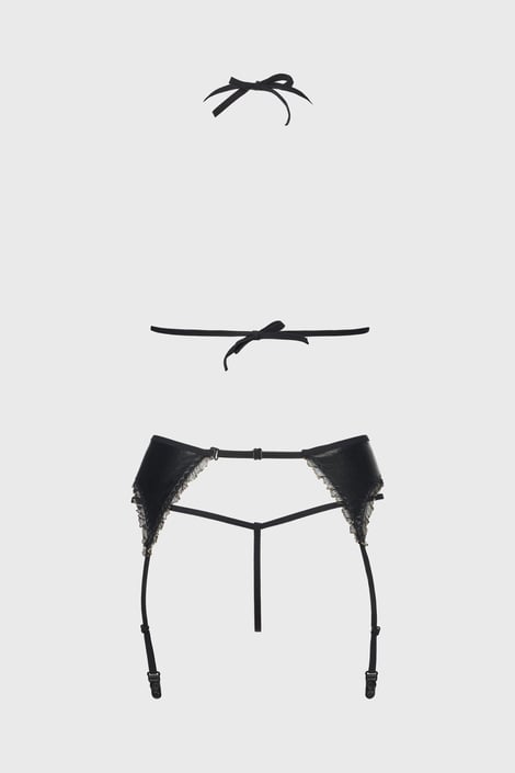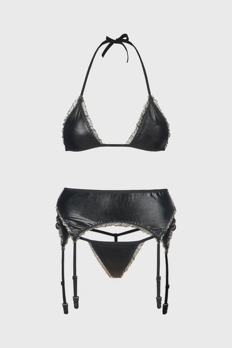 Set Capri seducător pentru iubitorii de latex strălucitor. Cupele triunghiulare, chiloțeii tanga și jartierele sunt decorate cu un canar delicat de tul cu fir de lurex strălucitor.