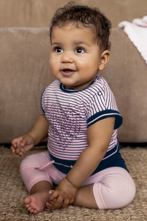 Set pentru fetițe Pink Heart, confecționat din bumbac moale. Tricoul mai lung/rochița este completat/ă de pantalon confortabil (cu bandă elastică în zona taliei).