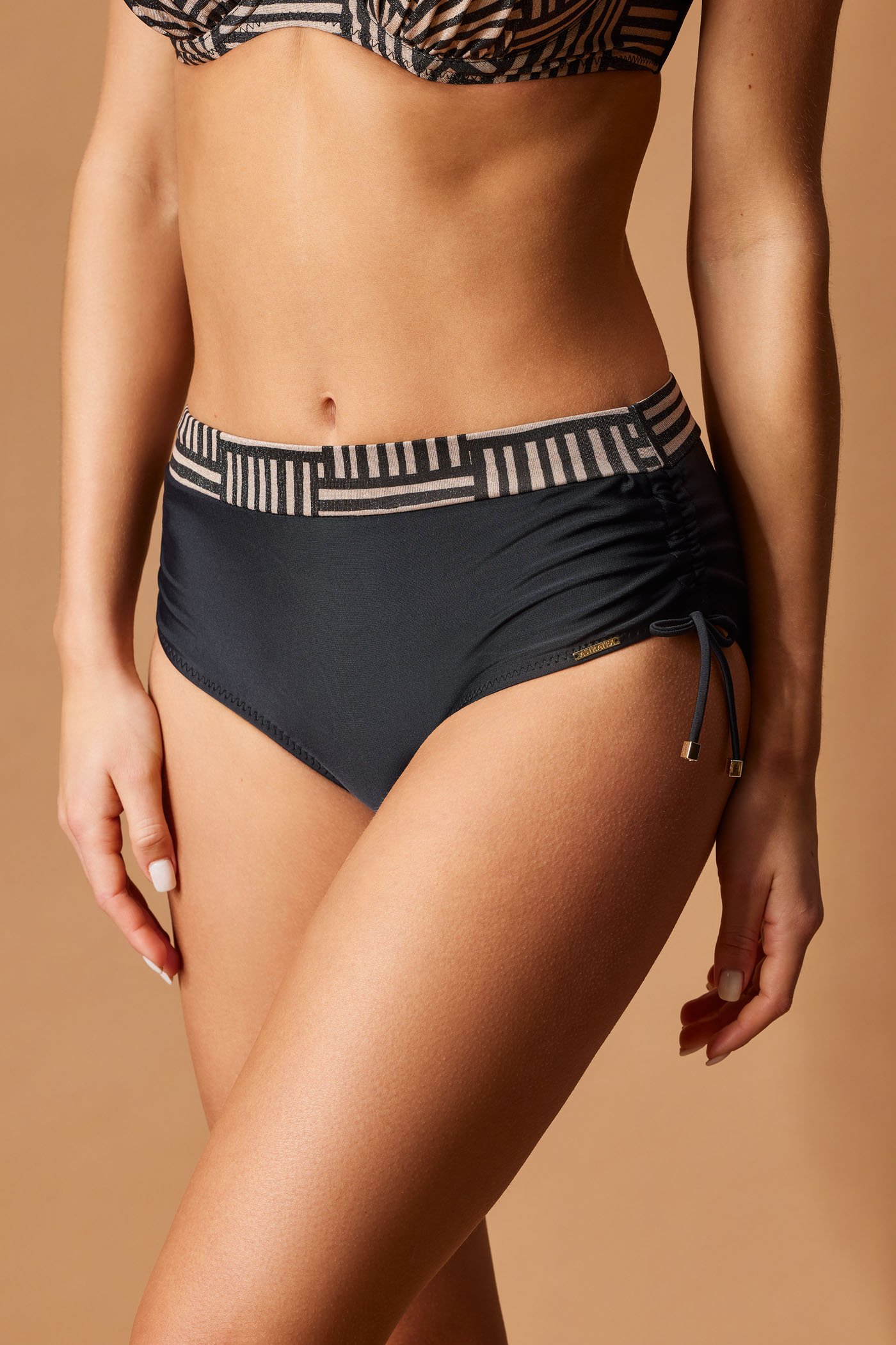 Slipul de la costumul de baie Shiny Sand este o piesă elegantă din atelierul Astratex. Modelul simplu negru este decorat doar de material ușor lucios în zona taliei. Cu șnurui pe părțile laterale, pentru ajustarea înălțimii decupajului.