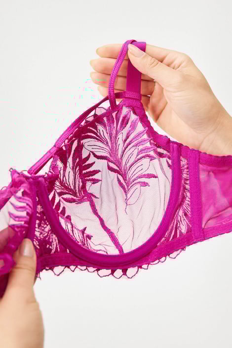 Sutienul Brillance Hot Pink va deveni o perlă a garderobei tale. Cupele neîntărite din tul fin sunt decorate cu model strălucitor, cu benzi strappy în partea superioară. Bretelele largi sunt completate de o a doua pereche de bretele subțiri reglabile. Circumferința este realizată din plasă dublă fină.