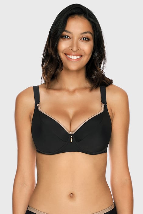 Sutienul elegant de la costumul de baie Elison I va fi apreciat mai ales de către doamnele cu sâni mari. Cupele ușor întărite învăluie și modelează sânii în mod natural, bretelele mai late asigură confort. Sutienul este decorat cu un tiv auriu strălucitor.