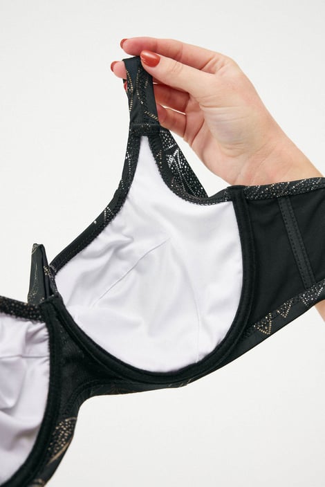 Sutien de baie Golden Leaves, de culoare neagră elegantă, cu un mic imprimeu auriu. Cupele neîntărite sunt extrem de confortabile și conferă sânilor tăi o formă rotundă naturală. Partea centrală este decorată cu o fundă pe care o poți lega singură după cum este necesar. Bretelele reglabile mai late nu jenează. Conceput din material rezistent la radiațiile UV, clor și sare de mare.