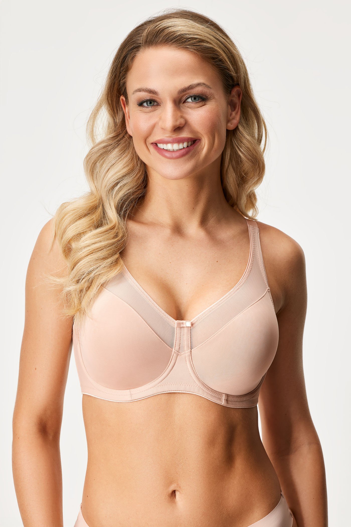 Femeile cu bustul mai plin vor aprecia sutienul Nina cu cupe neîntărite, cu efect de micșorare. Materialul elastic al cupelor se adaptează sânilor, îi modelează în mod natural și îi reduce vizual. Partea superioară a cupelor este decorată cu plasă fină, care se extinde până la bretele. Circumferința este formată dintr-o microfibră elastica mai rezistentă.
