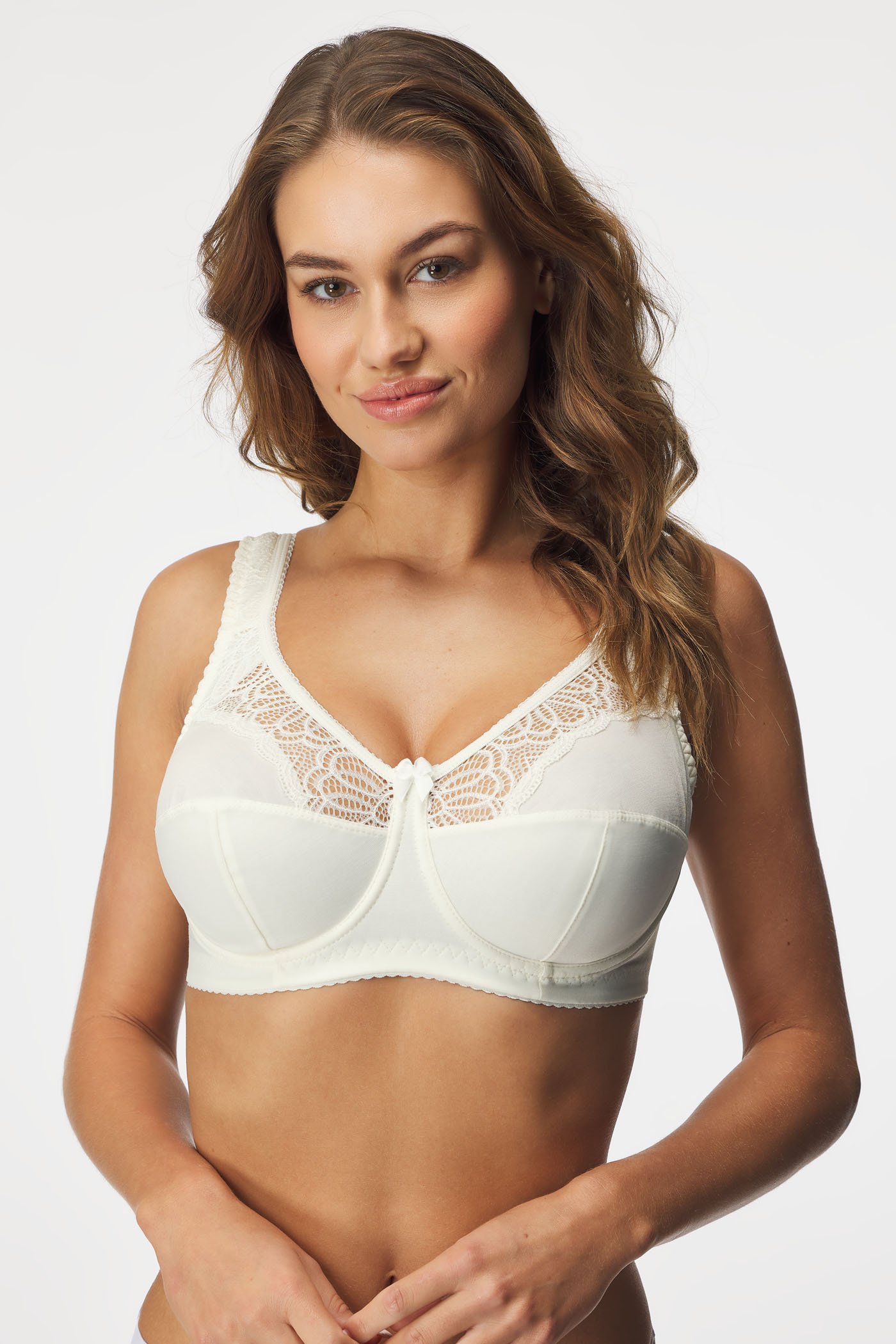 Sutienul Ledi cu efect de micșorare este extrem de confortabil. Cupele neîntărite sunt decorate cu dantelă plăcută. Panoul lateral de susținere și balenele clasice oferă susținerea necesară sânilor mai mari, iar centrul înalt ajută la apropierea sânilor.