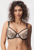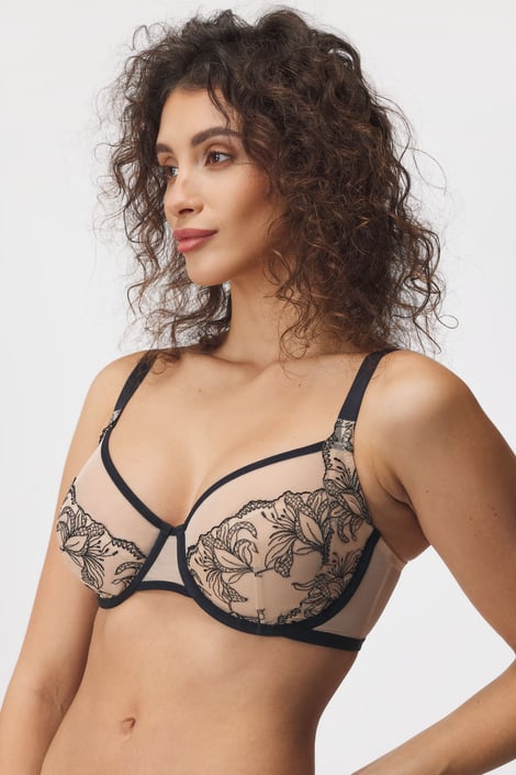Sutienul neîntărit Novah Curves are cupele cu broderii bogate. Într-un contrast impresionant de culoare a pielii și negru.