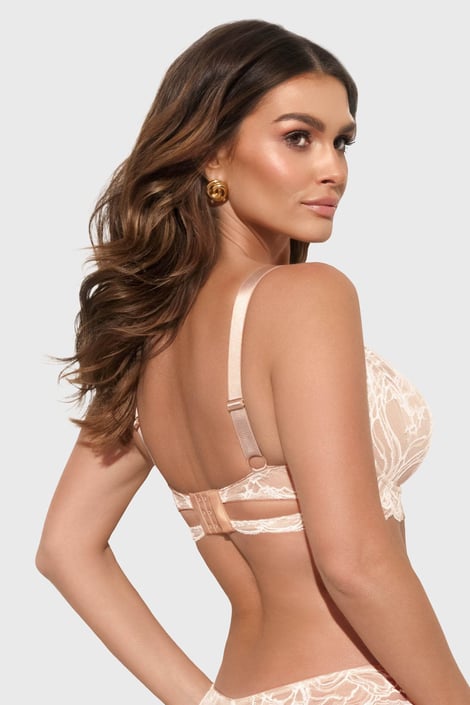 Sutienul rafinat Sand II îți va scoate în evidență atuurile. Cupele din dantelă, cu balene, sunt prevăzute cu un panou lateral întărit care apropie sânii. Zona decolteului este confecționată din tul moale de culoarea pielii, care accentuează și mai mult decolteul luxuriant. Balenele împreună cu centrul mai înalt mențin bustul la locul lui în mod fiabil.