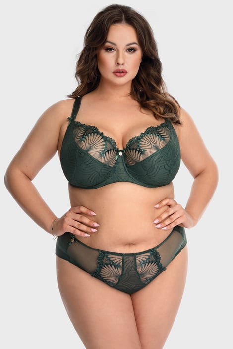 Sutien fermecător Selena Green îți împodobește curbele cu plasă delicată și broderie ornamentală. Cupele neîntărite în formă de T rotunjesc și sânii mai plini, iar bretelele late ajută distribuirea greutății acestora, pentru a ușura spatele.