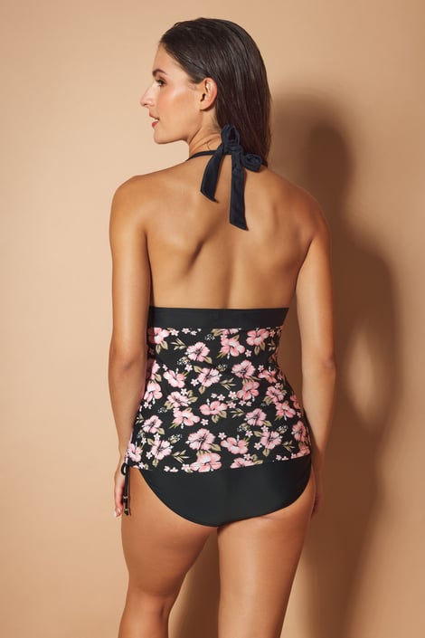 Tankini Beach Day cu motive florale tropicale. Cupele neîntărite și fără balene au în interior pernițe detașabile. Slipul clasic are șnururi pe părțile laterale, cu care se poate ajusta înălțimea decupajului.