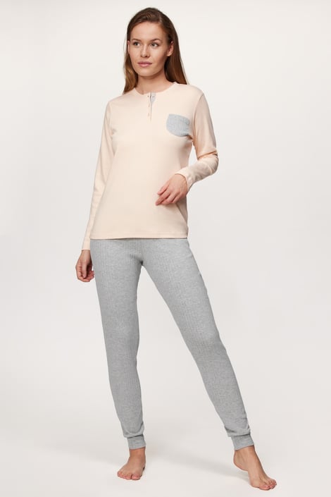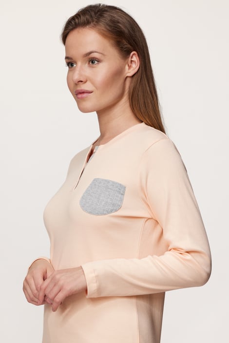 Tricou confortabil de pijama de damă Gentle din tricot 100% bumbac. Decolteu cu închidere cu nasturi și buzunar mic pe piept.